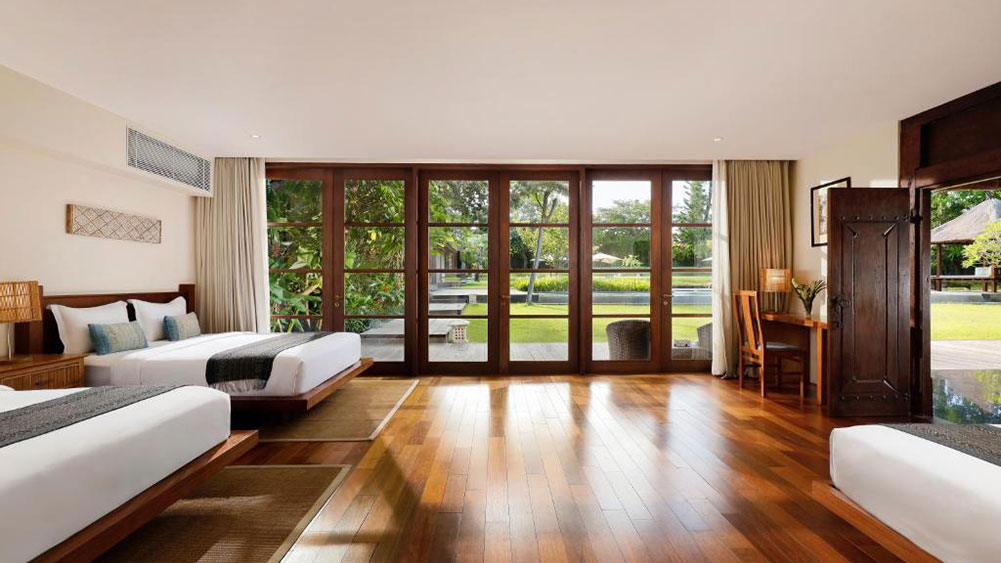 The villa has seven air-conditioned bedrooms. Four guest rooms are in the two-level, bedroom pavilion. All four bedrooms have doub